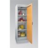 Przeznaczona do przechowywania materiałów łatwopalnych (niebezpiecznych) w pomieszczeniach roboczych (laboratoria, hale produkcyjne), w pobliżu miejsca pracy, w klasie ognioodporności 30 min, zgodnie z normą EN14470-1. Wyposażona w drzwi dwuskrzydłowe, 3 półki stałe oraz tacę dolną do zbierania wycieków z perforowaną pokrywą, umożliwiającą stworzenie dodatkowego poziomu składowania. Wysokość zawieszenia półek regulowana co 32 mm. Obudowa szafy wykonana z materiału B1 (drewniane panele ognioodporne) malowanej proszkowo w kolorze jasnoszarym RAL 7035. Drzwi w kolorze jasnoszarym RAL 7035. Standardowo zawiera system utrzymania skrzydeł drzwi w pozycji otwartej, dzięki czemu można wkładać i wyjmować pojemniki z szafy obiema rękami. Posiada mechanizm kontroli temperatury gwarantujący automatyczne zamknięcie i uszczelnienie drzwi w wypadku pożaru. Opcjonalnie dostępny wentylator do podłączenia przez złącze wentylacyjne DN 80, górna powierzchnia szafy. Zastosowanie regulowanych nóżek pozwala na łatwe poziomowanie i ustawienie szafy. Wymiary zewnętrzne S*G*W 1195*595*1935 mm, wymiary wewnętrzne S*G*W 1075*515*1600 mm, waga 225 kg, normy EN14470-1, DIN, TRbF20L/ISO3864, półka stała 3 szt, taca dolna (zbiornik ociekowy) 1 szt o pojemności 33 l, podstawa, drzwi 2-skrzydłowe, ognioodporność 30 min, szary.