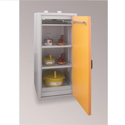Przeznaczona do przechowywania materiałów łatwopalnych (niebezpiecznych) w pomieszczeniach roboczych (laboratoria, hale produkcyjne), w pobliżu miejsca pracy, w klasie ognioodporności 30 min, zgodnie z normą EN14470-1. Wyposażona w drzwi jednoskrzydłowe, 2 półki stałe oraz tacę dolną do zbierania wycieków z perforowaną pokrywą, umożliwiającą stworzenie dodatkowego poziomu składowania. Wysokość zawieszenia półek regulowana co 32 mm. Obudowa szafy wykonana z materiału B1 (drewniane panele ognioodporne) malowanej proszkowo w kolorze jasnoszarym RAL 7035. Drzwi w kolorze jasnoszarym RAL 7035. Standardowo zawiera system utrzymania skrzydeł drzwi w pozycji otwartej, dzięki czemu można wkładać i wyjmować pojemniki z szafy obiema rękami. Posiada mechanizm kontroli temperatury gwarantujący automatyczne zamknięcie i uszczelnienie drzwi w wypadku pożaru. Opcjonalnie dostępny wentylator do podłączenia przez złącze wentylacyjne DN 80, górna powierzchnia szafy. Wymiary zewnętrzne S*G*W 595*595*1315 mm, wymiary wewnętrzne S*G*W 480*519*1108 mm, waga 121 kg, normy EN14470-1, DIN, TRbF20L/ISO3864, półka stała 2 szt, taca dolna (zbiornik ociekowy) 1 szt o pojemności 23 l, podstawa, drzwi 1-skrzydłowe, ognioodporność 30 min, szary.