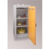 Przeznaczona do przechowywania materiałów łatwopalnych (niebezpiecznych) w pomieszczeniach roboczych (laboratoria, hale produkcyjne), w pobliżu miejsca pracy, w klasie ognioodporności 30 min, zgodnie z normą EN14470-1. Wyposażona w drzwi jednoskrzydłowe, 2 półki stałe oraz tacę dolną do zbierania wycieków z perforowaną pokrywą, umożliwiającą stworzenie dodatkowego poziomu składowania. Wysokość zawieszenia półek regulowana co 32 mm. Obudowa szafy wykonana z materiału B1 (drewniane panele ognioodporne) malowanej proszkowo w kolorze jasnoszarym RAL 7035. Drzwi w kolorze żółty RAL 1007. Standardowo zawiera system utrzymania skrzydeł drzwi w pozycji otwartej, dzięki czemu można wkładać i wyjmować pojemniki z szafy obiema rękami. Posiada mechanizm kontroli temperatury gwarantujący automatyczne zamknięcie i uszczelnienie drzwi w wypadku pożaru. Opcjonalnie dostępny wentylator do podłączenia przez złącze wentylacyjne DN 80, górna powierzchnia szafy. Wymiary zewnętrzne S*G*W 595*595*1315 mm, wymiary wewnętrzne S*G*W 480*519*1108 mm, waga 121 kg, normy EN14470-1, DIN,