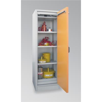 Przeznaczona do przechowywania materiałów łatwopalnych (niebezpiecznych) w pomieszczeniach roboczych (laboratoria, hale produkcyjne), w pobliżu miejsca pracy, w klasie ognioodporności 30 min, zgodnie z normą EN14470-1. Wyposażona w drzwi jednoskrzydłowe, 3 półki stałe oraz tacę dolną do zbierania wycieków z perforowaną pokrywą, umożliwiającą stworzenie dodatkowego poziomu składowania. Wysokość zawieszenia półek regulowana co 32 mm. Obudowa szafy wykonana z materiału B1 (drewniane panele ognioodporne) malowanej proszkowo w kolorze jasnoszarym RAL 7035. Drzwi w kolorze żółtym RAL 1007. Standardowo zawiera system utrzymania skrzydeł drzwi w pozycji otwartej, dzięki czemu można wkładać i wyjmować pojemniki z szafy obiema rękami. Posiada mechanizm kontroli temperatury gwarantujący automatyczne zamknięcie i uszczelnienie drzwi w wypadku pożaru. Opcjonalnie dostępny wentylator do podłączenia przez złącze wentylacyjne DN 80, górna powierzchnia szafy. Zastosowanie regulowanych nóżek pozwala na łatwe poziomowanie i ustawienie szafy. Wymiary zewnętrzne S*G*W 595*595*1935 mm, wymiary wewnętrzne S*G*W 480*519*1660 mm, waga 175 kg, normy EN14470-1, DIN, TRbF20L/ISO3864, półka stała 3 szt, taca dolna (zbiornik ociekowy) 1 szt o pojemności 23 l, podstawa, drzwi 1-skrzydłowe, ognioodporność 30 min, szary/żółty.