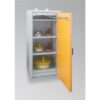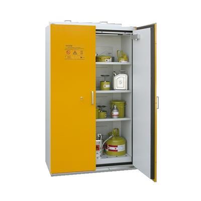 Przeznaczona do przechowywania materiałów łatwopalnych (niebezpiecznych) w pomieszczeniach roboczych (laboratoria, hale produkcyjne), w pobliżu miejsca pracy, w klasie ognioodporności 90 min, zgodnie z normą EN14470-1. Wyposażona w drzwi dwuskrzydłowe, 2 półki stałe oraz tacę dolną do zbierania wycieków z perforowaną pokrywą, umożliwiającą stworzenie dodatkowego poziomu składowania. Wysokość zawieszenia półek regulowana co 64 mm. Obudowa wykonana z blachy stalowej malowanej proszkowo w kolorze jasnoszarym RAL 7035. Wnętrze pokryte laminatem HPL. Drzwi w kolorze jasnoszarym RAL 7035 z pneumatycznym wspomaganiem, nie wymagającym zasilania, co ułatwia otwieranie i zamykanie. Standardowo zawiera system utrzymania skrzydeł drzwi w pozycji otwartej, dzięki czemu można wkładać i wyjmować pojemniki z szafy obiema rękami. Posiada mechanizm kontroli temperatury gwarantujący automatyczne zamknięcie i uszczelnienie drzwi w wypadku pożaru. Opcjonalnie dostępny wentylator do podłączenia przez złącze wentylacyjne DN 80, górna powierzchnia szafy. Zastosowanie regulowanych nóżek pozwala na łatwe poziomowanie i ustawienie szafy. Wymiary zewnętrzne S*G*W 1190*598*1315 mm, wymiary wewnętrzne S*G*W 1087*430*1080 mm, waga 380 kg, normy EN14470-1, DIN, TRbF20 L/ISO3864, półka stała 2 szt, taca dolna (zbiornik ociekowy) 1 szt o pojemności 33 l, podstawa, ognioodporność 90 min.