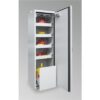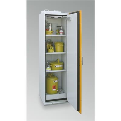 Przeznaczona do przechowywania materiałów łatwopalnych (niebezpiecznych) w pomieszczeniach roboczych (laboratoria, hale produkcyjne), w pobliżu miejsca pracy, w klasie ognioodporności 90 min, zgodnie z normą EN14470-1. Wyposażona w drzwi jednoskrzydłowe z zawiasami po prawej stronie, 3 półki stałe oraz tacę dolną do zbierania wycieków z perforowaną pokrywą, umożliwiającą stworzenie dodatkowego poziomu składowania. Wysokość zawieszenia półek regulowana co 64 mm. Obudowa wykonana z blachy stalowej malowanej proszkowo w kolorze jasnoszarym RAL 7035. Wnętrze pokryte laminatem HPL. Drzwi w kolorze jasnoszarym RAL 7035 z pneumatycznym wspomaganiem, nie wymagającym zasilania, co ułatwia otwieranie i zamykanie. Standardowo zawiera system utrzymania skrzydła drzwi w pozycji otwartej, dzięki czemu można wkładać i wyjmować pojemniki z szafy obiema rękami. Posiada mechanizm kontroli temperatury gwarantujący automatyczne zamknięcie i uszczelnienie drzwi w wypadku pożaru. Opcjonalnie dostępny wentylator do podłączenia przez złącze wentylacyjne DN 80, górna powierzchnia szafy. Zastosowanie regulowanych nóżek pozwala na łatwe poziomowanie i ustawienie szafy. Wymiary zewnętrzne S*G*W 595*598*1935 mm, wymiary wewnętrzne S*G*W 492*430*1700 mm, waga 306 kg, normy EN14470-1, DIN, TRbF20 L/ISO3864, półka stała 3 szt, taca dolna (zbiornik ociekowy) 1 szt o pojemności 22 l, podstawa, ognioodporność 90 min.