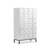 Szafka osobista na nóżkach. Wzmacniane drzwi na zawiasach z gumową amortyzacją zapewniającą ciche zamykanie. Otwory wentylacyjne w górnej i dolnej części. Wysokiej jakości szafki osobiste wykonane z blachy stalowej lakierowanej proszkowo. Wykończenie lakierem proszkowym zapewnia trwałość oraz odporność na zarysowania i intensywne użytkowanie w trudnych środowiskach. Korpus wykonany z 0.7 mm blachy stalowej, drzwi ze stali o grubości 0.8 mm.