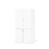 Wyposażona w cztery półki, z których jedna jest zamocowana na stałe. Pozostałe półki są regulowane, co oznacza, że można łatwo dostosować szafę do potrzeb w zakresie przechowywania. Wyposażona w dwie pary drzwi ukrywające zawartość półek. Górna para drzwi wyposażona w zamek. Mebel wykonano z laminatu, który jest zarówno wytrzymały, jak i łatwy do czyszczenia. Szafa jest dostarczona zmontowana, wyposażona w solidne uchwyty oraz samozamykające zawiasy.