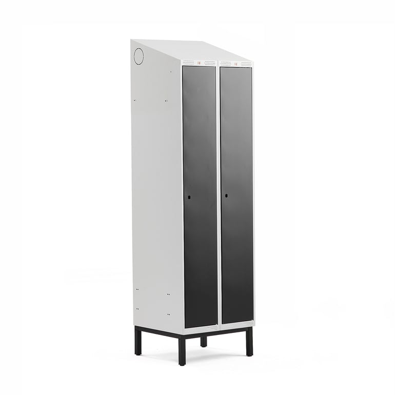 Pochyłe daszki podnoszą poziom higieny i uniemożliwiają przechowywanie na szafach. Drzwi stalowe wyposażone zostały w zabezpieczenie przed szerokim otwarciem i gumową amortyzację zapewniającą ciche zamykanie.