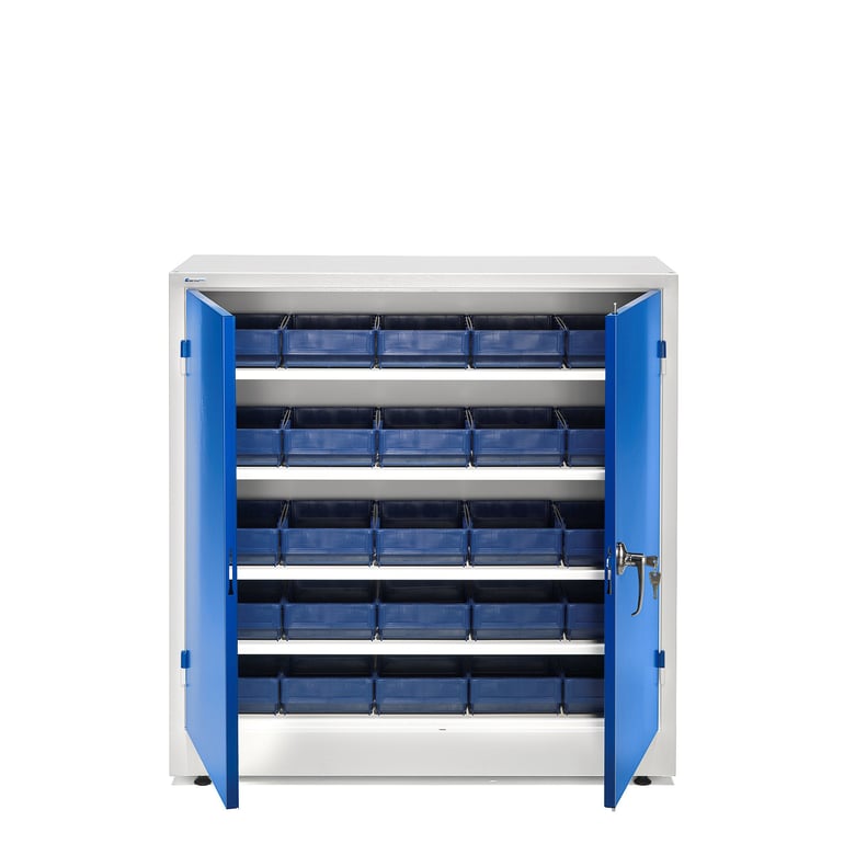 Szafka wyposażona w 25 pojemników, przestawne półki i zamykane drzwi dwuskrzydłowe. Klasyczna i niedroga szafa, która zapewnia dużo miejsca do przechowywania i nadaje się do wielu środowisk! Regulowane półki i 25 pojemników pozwalają łatwo zaprowadzić porządek w miejscu pracy.