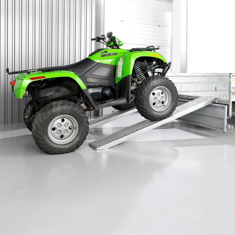 Rampa najazdowa w formie szyn. Do załadunku niewielkich pojazdów na przyczepy itp. Nasze szyny najazdowe są lekkie i łatwe do przenoszenia. Ryflowana struktura zapewnia dobrą przyczepność, a zagięta krawędź górna stabilizuje szyny podczas użytkowania. Aluminiowe szyny najazdowe o lekkiej konstrukcji. Szyny idealnie sprawdzą się przy załadunku na przyczepy, samochody dostawcze itp. Ryflowana struktura zapewnia dobrą przyczepność a zagięta krawędź górna stabilizuje szyny na przyczepie etc.