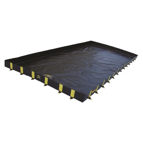 Wykonana z bardzo trwałej tkaniny powlekanej PCV, odpornej na promieniowanie UV. Całość stanowi jednoczęściową konstrukcję o szybkim i prostym montażu, bez użycia narzędzi. Charakteryzuje się wysoką wytrzymałością i odpornością chemiczną na silnie agresywne płyny, w tym m.in. ropę, oleje, smary i większość kwasów. Posiada trzykrotnie większą odporność na przebicie i przetarcie, idealnie sprawdza się dla ruchu ciężkich pojazdów. W odróżnieniu od wanien o miękkich ściankach, w których może dojść do upadku ścianki i utraty ochrony przed wyciekiem, opatentowane wsporniki zawierające usztywnienia ze stali nierdzewnej zawsze utrzymują ścianki pod kątem 90° do podłoża, dzięki czemu stanowią pewne zabezpieczenie przed wyciekiem. Opatentowany system stawiania ścianek zintegrowany z wanną wychwytową zapewnia swobodny wjazd i wyjazd pojazdów. Proste naciśnięcie na ściankę odblokowuje wspornik i kładzie ściankę, umożliwiając wjazd pojazdu do wnętrza wanny pod dowolnym kątem. Wbudowane usztywnienia ścianek pozwalają na efektywne wykorzystanie całej powierzchni wanny wychwytowej i znacznie ograniczają ryzyko potknięcia się o jej ściankę. Wzmocniona konstrukcja narożników oraz ciągłe linie spojeń wykonanych techniką zgrzewania polem elektrycznym o wysokiej częstotliwości zapewniają nadzwyczaj wysoką wytrzymałość całej wanny, szczelność szwów, całkowitą nieprzepuszczalność dla cieczy i długotrwałą eksploatację. Wykończenia górnych krawędzi ścianek zapobiegają strzępieniu się i zwiększają wytrzymałość produktu. Każdy wspornik posiada wytrzymały zaczep ze stali nierdzewnej, umożliwiający zamocowanie wanny do podłoża na wypadek silnego wiatru. Opcjonalnie dostępne; kotwy i maty do podłoża, maty pod koła oraz dywaniki pod koła, zwiększające odporność wanny na kamienistych powierzchniach. Składana konstrukcja przenośnej wanny umożliwia szybkie jej złożenie do transportu i przechowywania. Wymiary po rozłożeniu (wewnętrzne) S*D*W 3700*15200*305 mm, wymiary po (złożeniu) S*D*W 914*914*508 mm, pojemność wychwytowa 16981 l, waga 131,5 kg, kolor czarny.