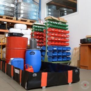 Elastyczna wanna wychwytowa przeznaczona do magazynowania beczek oraz zbiorników IBC, a także ograniczania wycieków ze zbiorników, zabezpieczania transformatorów, akumulatorów, cieknących pojemników, maszyn i rur.