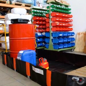 Elastyczna wanna wychwytowa przeznaczona do magazynowania beczek oraz zbiorników IBC, a także ograniczania wycieków ze zbiorników, zabezpieczania transformatorów, akumulatorów, cieknących pojemników, maszyn i rur.