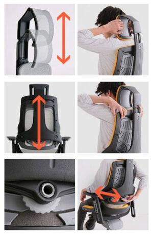 Producent tego wyjątkowego fotela do komputera i pracy zapewnił możliwość regulowania głębokości oparcia w odcinku lędźwiowym, zamontował podłokietniki z tworzywa z regulacją wysokości i kąta odchylenia na boki oraz zagwarantował maksymalne podparcie pleców w każdej pozycji odchylenia oparcia.
