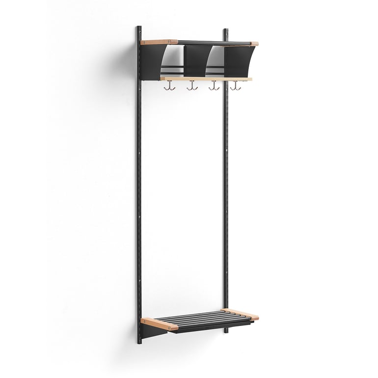 Moduł podstawowy składa się z kompaktowego wieszaka ze stojakiem na obuwie. Wieszak posiada dwie przegrody, półkę na nakrycia głowy i cztery haczyki kotwicowe. Półka na nakrycia głowy zostałą wykonana z rur stalowych, co zapobiega gromadzeniu się kurzu i zanieczyszczeń. Ociekacz pod stojakiem na obuwie zbiera zanieczyszczenia i wodę, co pomaga utrzymać porządek. Obie półki posiadają elementy z drewna brzozowego. Dwa ścienne słupki są perforowane, co umożliwia zawieszenie półek na dowolnej wysokości.