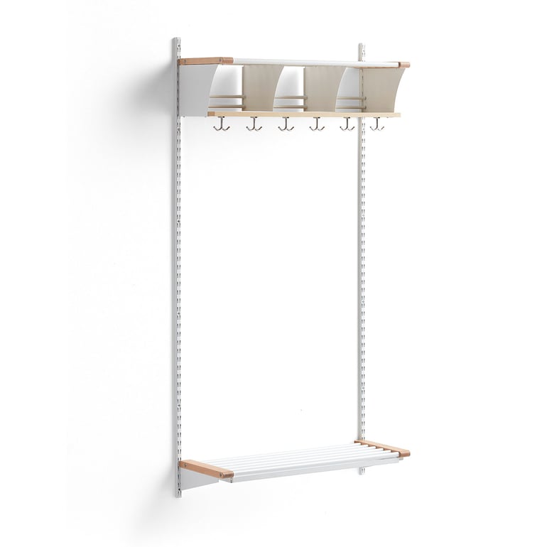 Wieszak ze stojakiem na obuwie. Dwa słupki ścienne, stojak na obuwie z ociekaczem oraz wieszak z przegrodami i sześcioma haczykami kotwicowymi. Można dokupić moduł dodatkowy i wiele akcesoriów dodatkowych. Seria JEPPE to regały do szatni z możliwością rozbudowy. Idealne do szkół i przedszkoli. Seria pozwala łatwo stworzyć funkcjonalną i przemyślaną szatnię w szkole lub przedszkolu. Praktyczny moduł podstawowy stanowi bazę systemu. Przy pomocy modułów dodatkowych łatwo rozbudować system na dowolną szerokość. Można dodać sprytne akcesoria takie jak stojaki na obuwie i osuszacze do rękawiczek i czapek. Dzięki serii JEPPE łatwo dostosować szatnię do potrzeb szkoły lub przedszkola!