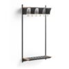 Kompaktowy moduł podstawowy wykonano z lakierowanej stali. Posiada wieszak na odzież i stojak na buty. Wieszak na odzież posiada trzy przegrody, półkę na nakrycia głowy i sześć haczyków kotwicowych. Półka na nakrycia głowy została wykonana z rur stalowych, co zapobiega gromadzeniu się kurzu i zanieczyszczeń. Ociekacz pod stojakiem na obuwie zbiera zanieczyszczenia i wodę, co pomaga utrzymać porządek. Obie półki posiadają elementy z drewna brzozowego. Dwa ścienne słupki są perforowane, co umożliwia zawieszenie półek na dowolnej wysokości.