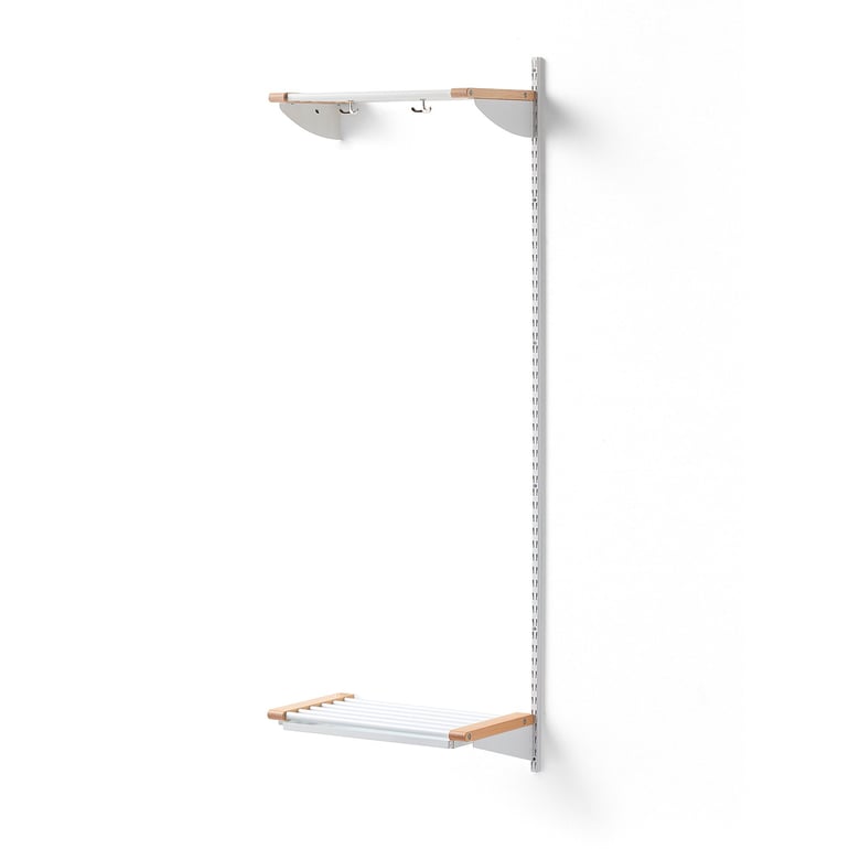 Moduł dodatkowy do regału JEPPE z półką na nakrycia głowy i stojakiem na obuwie. Słupek ścienny, półka na nakrycia głowy z haczykami oraz stojak na buty z ociekaczem. Wymaga modułu podstawowego. Rozbuduj regał na obuwie i okrycia głowy JEPPE przy użyciu jednego lub kilku modułów dodatkowych z lakierowanej blachy stalowej.