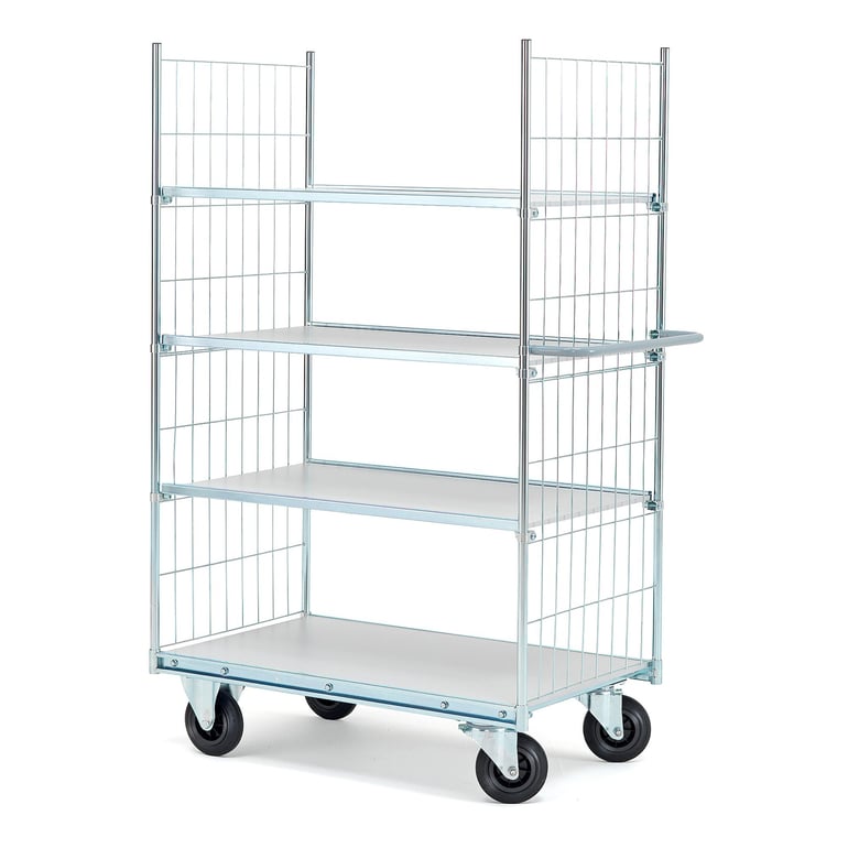 Wszechstronny wózek z podwoziem z galwanizowanej stali. Wózek posiada dwie wysokie ramy z siatki i cztery półki, w tym trzy z regulacją wysokości. Wygodny uchwyt na jednym z boków ułatwia manewrowanie wózkiem. Funkcjonalny wózek z półkami. Niezwykle mocny i wytrzymały. Wytrzymałe koła sprawdzą się idealnie przy ciężkim załadunku i ułatwią sterowanie wózkiem. Dwa koła stałe oraz dwa samonastawne. Koła zapewniają stabilny transport. Ramy wykonane z rur stalowych o grubości 22 mm i siatki z drutu stalowego. Jedna rama z uchwytem dla łatwiejszego sterowania. Cztery szersze półki zapewniają mnóstwo miejsca na załadunek. Półki o grubości 12 mm pokryte zostały wytrzymałym, białym laminatem. Dolna półka montowana na stałe. Pozostałe trzy półki z regulacją wysokości, co ułatwia dostosowanie wózka do rozmiaru ładunku. Maks. równomierne obciążenie 300 kg. Zawartość utrzymywana jest na miejscu dzięki ramom i podwyższonym krawędziom półek.