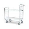 Łatwy w manewrowaniu wózek z rur stalowych. Dwie ramy z siatki stalowej i dwie półki z laminatu z bezstopniową regulacją wysokości. Wyposażony w wygodny uchwyt i cztery lekko toczące się koła. Funkcjonalny wózek z półkami. Niezwykle mocny i wytrzymały. Wózek posiada wytrzymałą stalową konstrukcję. Ramy wykonano z rur stalowych o przekroju 22 mm i siatki z drutu stalowego. Jedna z ram posiada szeroki uchwyt zapewniający łatwe sterowanie i mobilność. Dwie półki o grubości 12 mm pokryte wytrzymałym laminatem w kolorze białym. Regulacja wysokości półek. Ułatwia to dostosowanie wysokości wózka do rozmiaru ładunku. Maks. równomierne obciążenie 200 kg. Zawartość utrzymywana jest na miejscu dzięki ramom i podwyższonym krawędziom półek. Przystosowany do przewozu plastikowych skrzynek. Wyposażony w cztery kółka samonastawne.