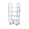 Łatwy w manewrowaniu wózek półkowy z wytrzymałych rur stalowych. Dwie ramy z siatki stalowej i cztery półki z laminatu z bezstopniową regulacją wysokości. Wyposażony w wygodny uchwyt i cztery lekko toczące się koła. Funkcjonalny wózek z półkami. Niezwykle mocny i wytrzymały. Wózek posiada wytrzymałą stalową konstrukcję. Wysokie ramy wykonano ze stalowej rury o grubości 22 mm i siatki z drutu stalowego. Jedna z ram posiada szeroki uchwyt zapewniający łatwe sterowanie i mobilność. Cztery półki o grubości 12 mm pokryte zostały wytrzymałym białym laminatem. Regulacja wysokości półek. Ułatwia to dostosowanie wysokości wózka do rozmiaru ładunku. Maks. równomierne obciążenie 200 kg. Zawartość utrzymywana jest na miejscu dzięki ramom i podwyższonym krawędziom półek. Przystosowany do przewozu plastikowych skrzynek. Wyposażony w cztery kółka samonastawne.