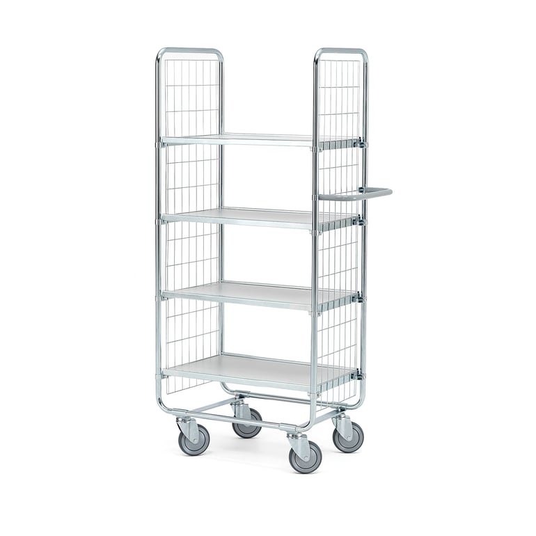 Łatwy w manewrowaniu wózek półkowy z wytrzymałych rur stalowych. Dwie ramy z siatki stalowej i cztery półki z laminatu z bezstopniową regulacją wysokości. Wyposażony w wygodny uchwyt i cztery lekko toczące się koła. Funkcjonalny wózek z półkami. Niezwykle mocny i wytrzymały. Wózek posiada wytrzymałą stalową konstrukcję. Wysokie ramy wykonano ze stalowej rury o grubości 22 mm i siatki z drutu stalowego. Jedna z ram posiada szeroki uchwyt zapewniający łatwe sterowanie i mobilność. Cztery półki o grubości 12 mm pokryte zostały wytrzymałym białym laminatem. Regulacja wysokości półek. Ułatwia to dostosowanie wysokości wózka do rozmiaru ładunku. Maks. równomierne obciążenie 200 kg. Zawartość utrzymywana jest na miejscu dzięki ramom i podwyższonym krawędziom półek. Przystosowany do przewozu plastikowych skrzynek. Wyposażony w cztery kółka samonastawne.