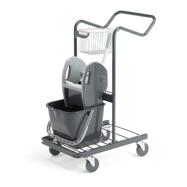 Wytrzymały wózek gospodarczy z wyżymaczką, wiadrem i koszykiem z siatki stalowej. Wyposażony w cztery koła skrętne, w tym jedno z hamulcem. Uprość mycie podłóg i sprzątanie w firmie dzięki trwałemu wózkowi gospodarczemu. Wózek ma solidną konstrukcję, jest wyjątkowo trwały i dobrze nadaje się do sprzątania w biurach, salach konferencyjnych, szkołach, strefach wejściowych i szatniach.