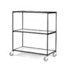 Praktyczny i trwały wózek półkowy ze stali lakierowanej proszkowo. Trzy stałe półki z laminatu wytrzymują duże obciążenie. Wózek posiada cztery gumowe koła skrętne dla łatwego prowadzenia i jest idealny do transportu pojemników i skrzynek o różnych kształtach. Nasz prosty i stabilny wózek to idealne rozwiązanie do przewozu pudeł i pojemników w różnych rozmiarach. Wyposażony jest w trzy stałe półki, każda z relingami o wysokości 10 mm. Wyklucza to ryzyko upadku towarów w trakcie transportu. Wózek posiada stylową ramę wykonaną z rur stalowych o okrągłym przekroju ( Ø 22 mm) lakierowanych proszkowo na kolor czarny. Duży udźwig pozwala na użytkowanie wózka w większości środowisk. Nadaje się do wielu różnych zadań transportowych. Każda półka wytrzymuje obciążenie 100 kg. Wózek wyposażono w cztery gumowe koła skrętne zapewniające ciche i płynne prowadzenie.