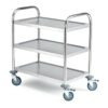 Odporny na uderzenia wózek ze stali nierdzewnej z 2 spawanymi półkami, które są łatwe w czyszczeniu. Posiada 2 uchwyty na krótszych bokach i lekko toczące się koła, w tym 2 z hamulcami. Doskonały do miejsc, gdzie czystość i higiena to priorytety. Odporny na uderzenia higieniczny wózek, który jest łatwy w czyszczeniu dzięki spawanym półkom i konstrukcji ze stali nierdzewnej. Wózek idealnie nadaje się do środowisk, gdzie higiena jest priorytetem, takich jak kuchnie i stołówki. Idealne rozwiązanie do transportu towarów takich jak pożywienie, sprzęt kuchenny, rondle i duże pojemniki. Słupki na krótszych bokach służą jako elastyczne uchwyty do prowadzenia. Koła skrętne o średnicy 100 mm na łożyskach rolkowych z gumowymi oponami. Zapewniają one cichą i płynną pracę wózka. Ułatwiają również manewrowanie. Dwa koła wyposażono w hamulce, co daje możliwość unieruchomienia wózka podczas załadunku itp. Maksymalne równomierne obciążenie 100 kg.