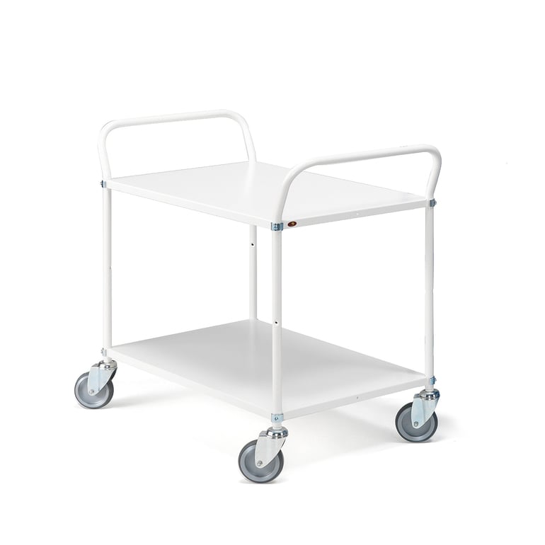 Wszechstronny wózek z półkami wykonany z lakierowanej stali. Dwie półki z płyty MDF z możliwością odwrócenia. Stabilna konstrukcja z uchwytami na krótszych bokach i czterema kołami dla płynnego prowadzenia. Praktyczny i funkcjonalny wózek z półkami. Maksymalne obciążenie każdej półki do 100 kg przy równomiernym rozmieszczeniu ładunku. Półki są dwustronne, co sprawia, że można je umieszczać podwyższaną krawędzią ku górze lub ku dołowi.