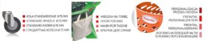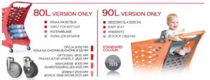 | Ładowność | wózkiem MINI 80L można przewozić towary o łącznej wadze do 55 kg, w tym max. 40 kg w koszu wózka oraz max. 15 kg. na półce na butelki |