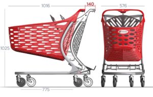 Wózek może zostać spersonalizowany poprzez umieszczenie etykiety z logo sklepu na przodzie kosza oraz na rączce wózka.