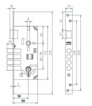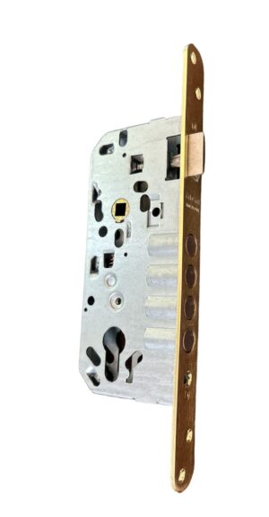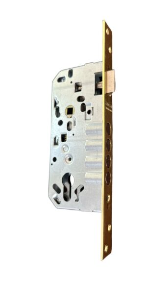 Zamek wpuszczany do drzwi drewnianych ryglowany czterema bolcami, uniwersalny. Rozstaw zamka 85 mm, dormas 50 mm. Otwór 8 mm pod klamkę. Mechanizm wewnętrzny oraz obudowa wykonane zostały ze stali w ocynku żółtym, bolce wysuwają się na 20 mm. Zamek zgodny z normą EN 12209:2004