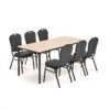 Zestaw mebli składający się z prostokątnego stołu i sześciu krzeseł, które można ustawiać jedno na drugim. Stół jest jednocześnie solidny, trwały i łatwy w czyszczeniu. Krzesła z miękko wyściełanymi siedziskami i oparciami. Praktyczny zestaw mebli składający się ze stołu i krzeseł, który idealnie sprawdzi się w niewielkich pokojach socjalnych, stołówkach i salach konferencyjnych. Stół i krzesła są niezwykle wszechstronne i nadają się do wielu różnych zastosowań. W razie potrzeby można również używać krzeseł osobno, na przykład dla publiczności na różnych wydarzeniach.