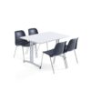 Zestaw mebli z trwałym stołem wyposażonym w prostokątny blat z laminatu oraz sztaplowanymi krzesłami z siedziskami zintegrowanymi z oparciami. Wytrzymałe i łatwe w pielęgnacji meble, które są idealne do stołówek i pomieszczeń socjalnych. Stół i krzesła sprawdzą się w stołówkach, jadalniach, kawiarniach i innych miejscach, gdzie potrzeba wytrzymałych i łatwych w czyszczeniu mebli. Nowoczesne wzornictwo elementów kompletu pozwala je łatwo łączyć z innymi meblami.