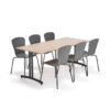 Kompletny zestaw mebli ze stołami i krzesłami wykonanymi z trwałych materiałów. Doskonale nadaje się do szkolnych stołówek, kafeterii i podobnych miejsc. Krzesła mają elegancki kształt i można je układać w stosy, co ułatwia czyszczenie. Poręczny komplet ze stołem i krzesłami o nowoczesnym, eleganckim wzornictwie. Meble są trwałe i łatwe do czyszczenia, dzięki czemu doskonale nadają się do pomieszczeń socjalnych, stołówek szkolnych, kafeterii itp.