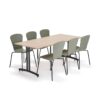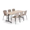 Kompletny zestaw mebli ze stołami i krzesłami wykonanymi z trwałych materiałów. Doskonale nadaje się do szkolnych stołówek, kafeterii i podobnych miejsc. Krzesła mają elegancki kształt i można je układać w stosy, co ułatwia czyszczenie. Poręczny komplet ze stołem i krzesłami o nowoczesnym, eleganckim wzornictwie. Meble są trwałe i łatwe do czyszczenia, dzięki czemu doskonale nadają się do pomieszczeń socjalnych, stołówek szkolnych, kafeterii itp.