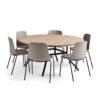 Nowoczesny zestaw mebli z sześcioma krzesłami obitymi tkaniną i bardzo dużym stołem. Stół i krzesła idealnie nadają się do sal konferencyjnych i stołówek. Krzesła oferują stylowy, nowoczesny design i wygodne, wyściełane siedziska. Blat jest pokryty wytrzymałym laminatem w kolorze dębu. Stylowy zestaw mebli, który pomieści kilka osób! Stół i krzesła są wygodne, stylowe i praktyczne. Idealnie nadają się do stołówek oraz na spotkania i konferencje.