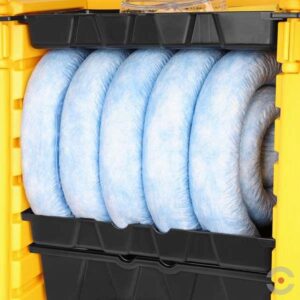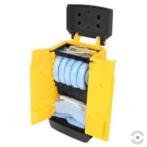 Zestaw mobilny Kaddie wyposażony w sorbenty polipropylenowe hydrofobowe (niebieskie) służy do pochłaniania olejów, paliw, płynów na bazie oleju oraz produktów ropopochodnych. Zapewnia natychmiastowy dostęp do sorbentów o zróżnicowanych kształtach, co w sposób zasadniczy decyduje o powodzeniu akcji usuwania rozlewów lub ograniczania nagłych wycieków.